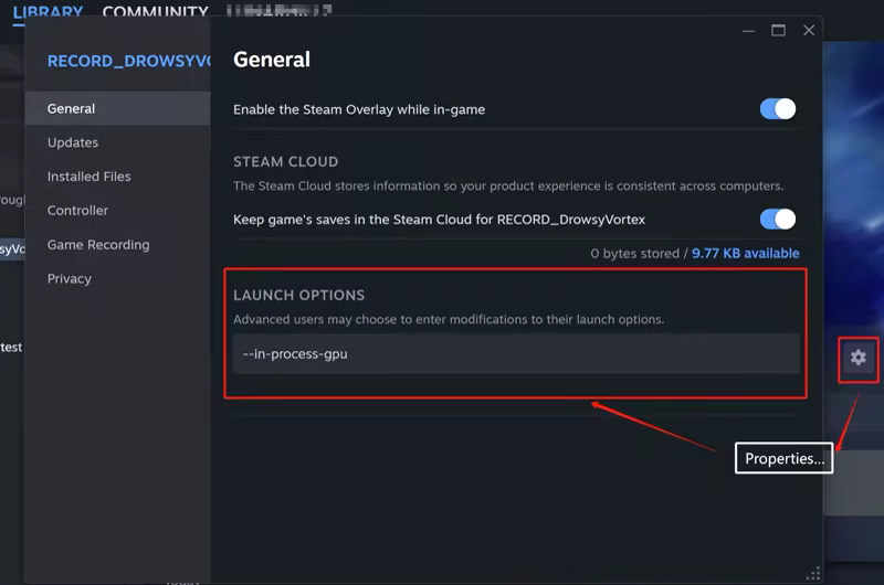 2. Paste it into Library > RECORD_DrowsyVortex > Manage > Properties... > Launch Options (as shown in the picture)